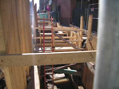A nice example of the heavy planking that is used to support the walls of a trench as it is dug deeper and deeper.